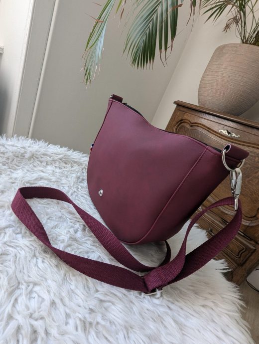 Ce modèle FaBul’E.sac (mini) sac Besace femme grenat, fabriqué dans notre atelier en Bretagne,